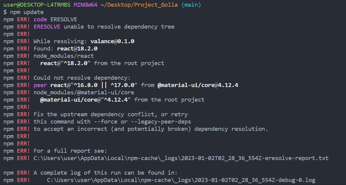 리액트 프로젝트 clone할 때마다 이유는 모르겠지만 npm update를 해야 하는데 에러가 발생했다. 검색해 보니 버전이 충돌하는 거 같은데 충돌이 일어나도 강제로 설치하라는 명령어를 추가하니 에러 없이 잘 설치할 수 있었다.