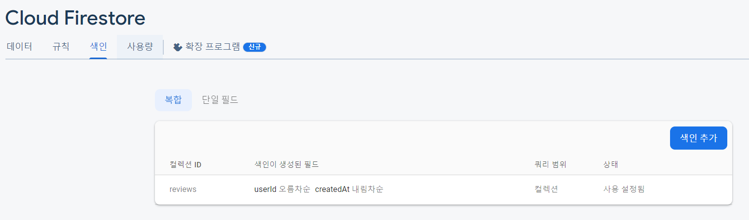 아마 쿼리에 "createdAt"과 "userId" 두 개의 조건을 설정해서 발생한 에러인 거 같다. 에러 메시지 옆에 클릭할 수 있는 링크가 하나 있는데 거기 들어가서 색인을 추가했더니 문제가 해결되었다.