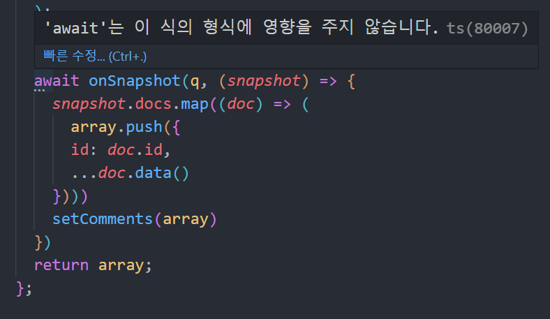 내 예상으로는 onSnapshot으로 데이터를 가져오기 전에 array에 할당한 빈 배열이 먼저 반환되는 상황인 거 같다. 그래서 await를 써보려고 했지만 어떤 이유에서인지 onSnapshot에는 await를 사용할 수 없는 거 같다.