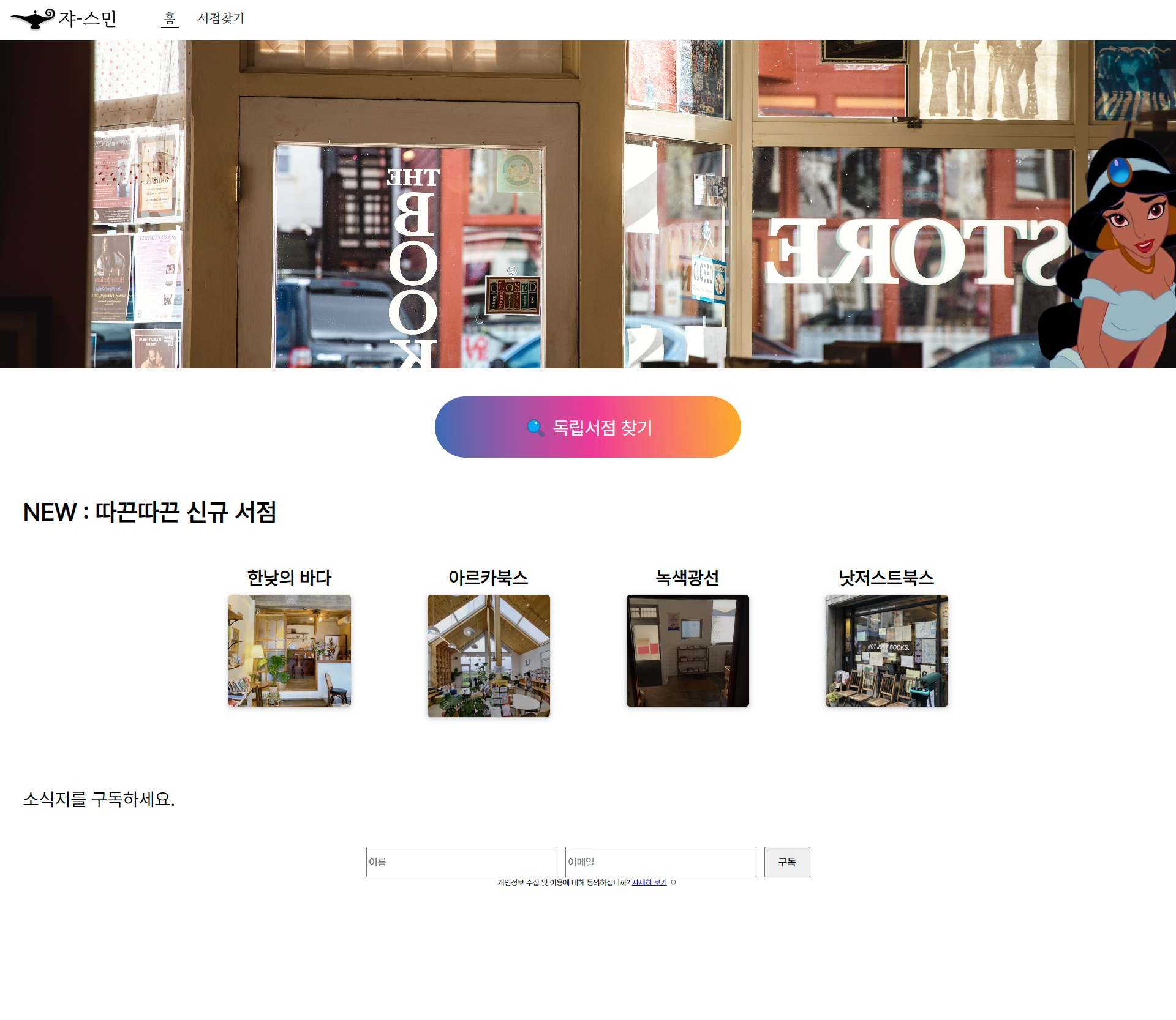 기존 메인 이미지는 너무 외국 서점 느낌이라 팀원들이 직접 찍은 독립서점 이미지를 넣고 텍스트 정렬을 좀 수정했다.