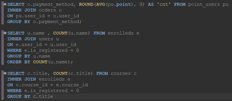 - where u.email like '%naver.com': users 테이블 email 필드값이 naver.com으로 끝나는 값만 가져온다.