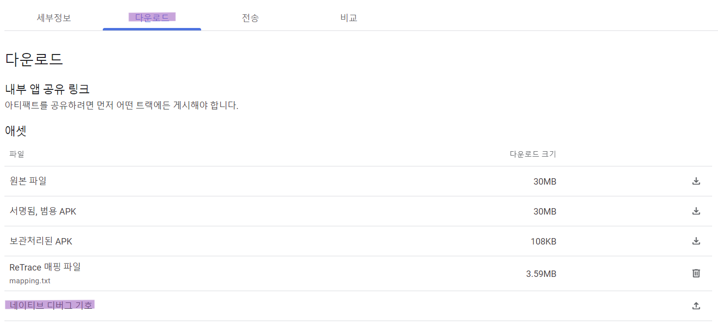 다운로드 탭에서 `네이티브 디버그 기호`에 압축한 `zip` 파일을 업로드한다.