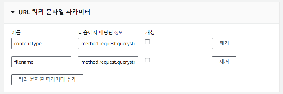 Lambda 함수에서 `filename`과 `contentType`을 쿼리 파라미터로 받기 때문에 위에서 생성한 API에 이 파라미터들을 등록해주어야 한다.