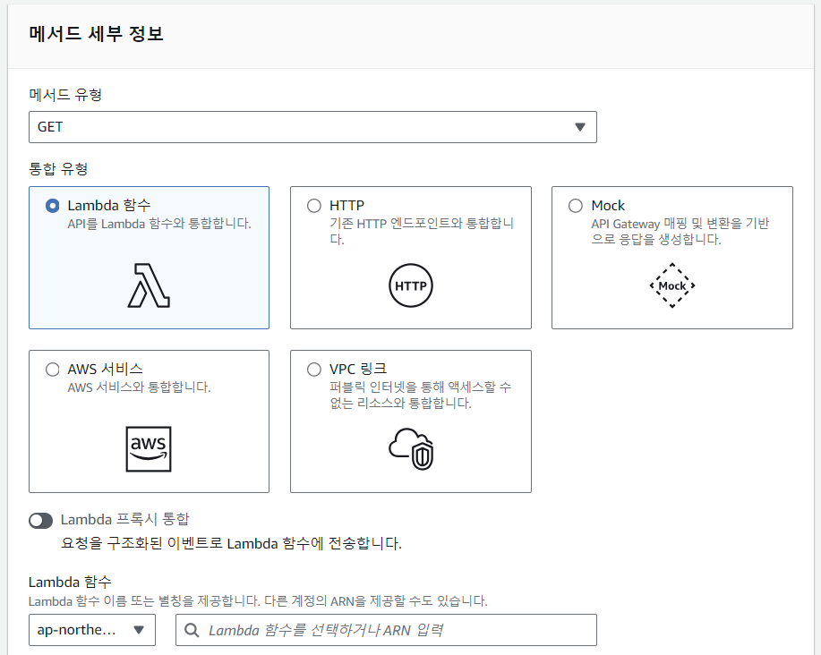 메서드 유형은 GET을 선택하고, 통합 유형은 Lambda 함수를 선택한다. Lambda 함수는 돋보기 아이콘이 있는 인풋을 클릭해서 미리 생성했던 Lambda 함수를 선택하면 된다. (일단은 이렇게 3개의 항목만 입력하면 된다.)
