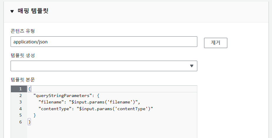 그리고 통합 요청 편집 페이지에서 입력해야 되는 항목이 하나 더 있다. 맨 밑에 매핑 템플릿이 있는데 콘텐츠 유형은 `application/json`으로, 템플릿 본문은 아래의 코드를 입력한다.