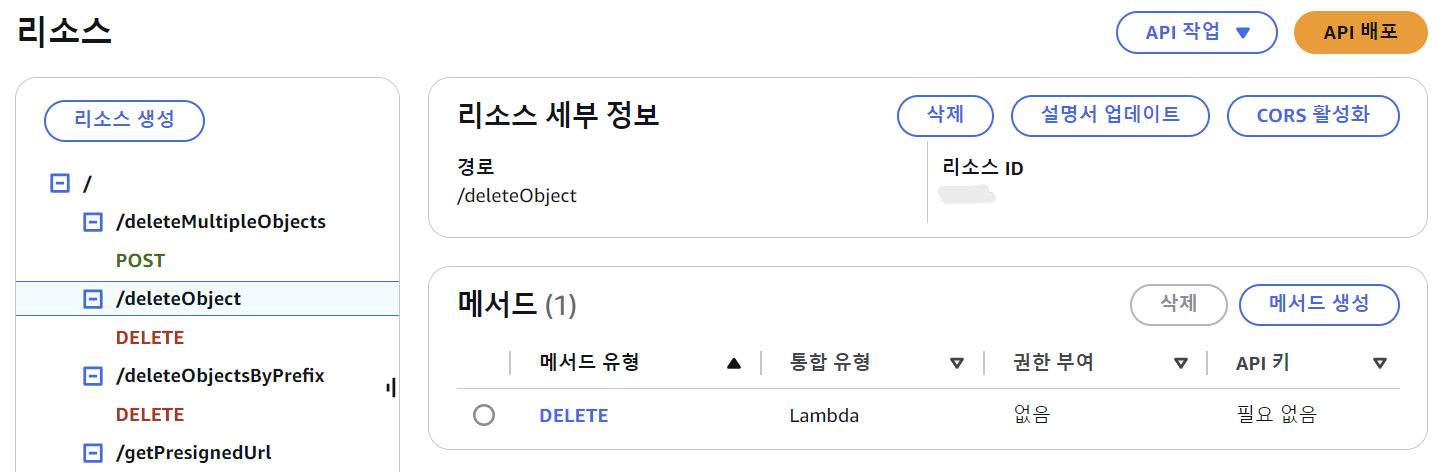 API Gateway에 `DELETE` 유형의 `/deletebject` 리소스를 생성한다.