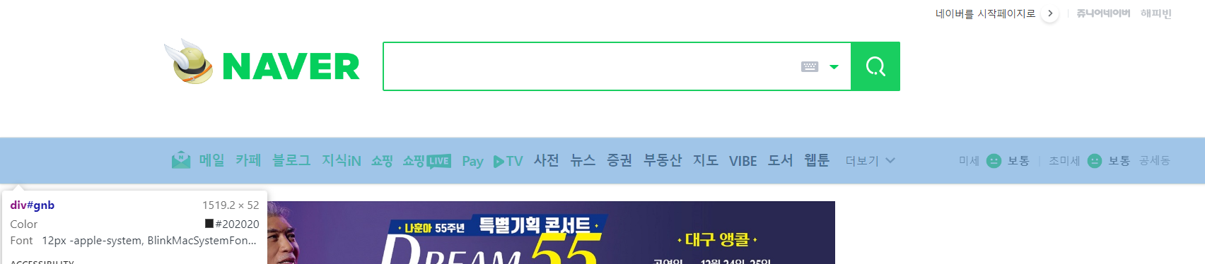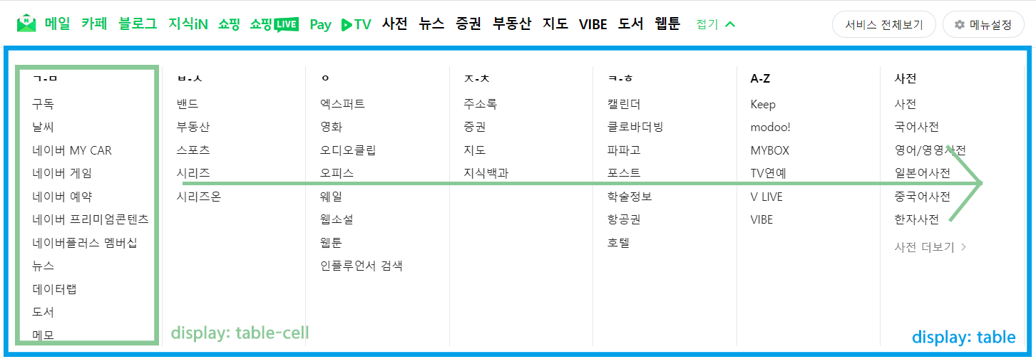 네비게이션 바를 정렬하는 데 float 속성을 사용했다. float: left로 설정하면 메일, 카페, 블로그 등 리스트의 각 항목이 왼쪽부터 차례대로 정렬된다.