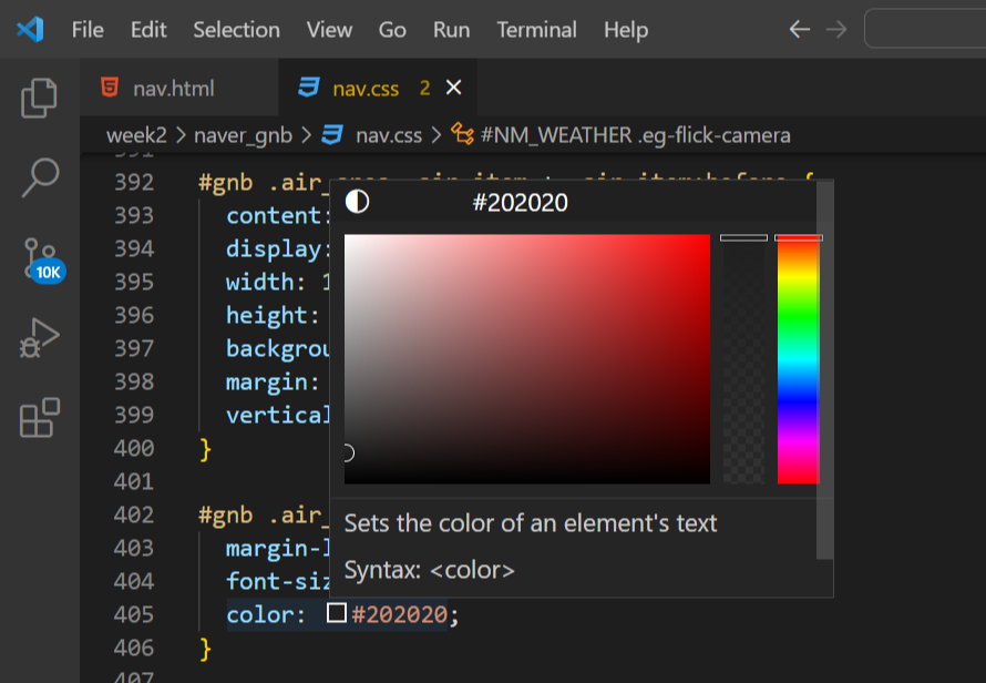 신기한 기능 알게 됐다. vscode에서 색상값에 마우스 올리면 이렇게 색상 창이 뜨는데 여기서 바로 컬러 눌러서 변경해 줄 수 있다..! 나만 몰랐을 수 있음ㅋㅋ