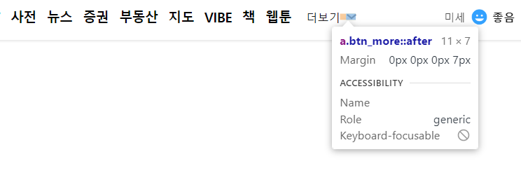 .btn_more:after 더보기 옆에 화살표 아이콘을 넣기 위해서 사용한 가상 요소인데 after를 입력하니까 아이콘이 텍스트 우측에 나타난 것을 볼 수 있다. 만약 .btn_more:before라고 작성한다면 아이콘이 텍스트 좌측에 삽입된다.
