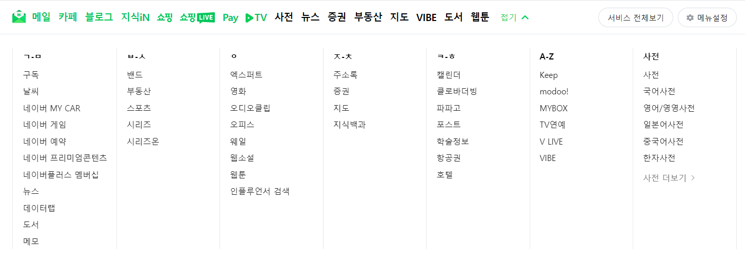 <dl> 태그는 정의형 목록이라고 하고 <dl> 태그 안에 <dt> 타이틀 태그, <dd> 설명 태그를 넣을 수 있다. 굳이 <dl> 태그를 사용한 것은 리스트 안에서 <dt> 태그를 사용하여 전체 서비스를 자음에 따라 ㄱ-ㅁ ㅂ-ㅅ 등으로 구역을 나눠서 타이틀을 넣고 구분을 하기 위함이 아니었을까 싶다.