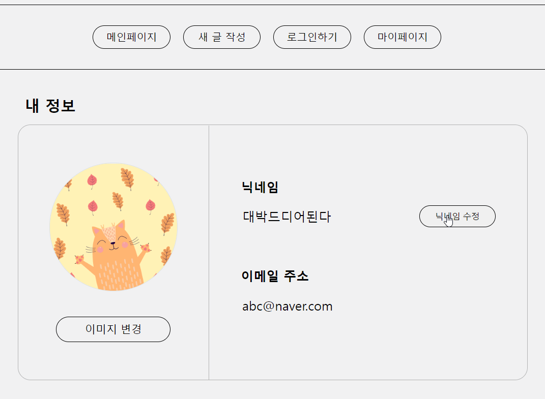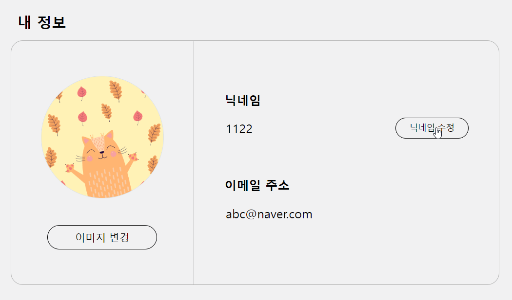 닉네임 수정 기능을 어떤 방식으로 구현할까 고민을 많이 했었다. 아예 input창을 닉네임 밑에 놓는 방법도 있고, 토글 기능으로 input 창을 보여줄 수도 있고, 모달 창을 띄우는 방법도 있었다. 결과적으로는 토글 기능을 이용하기로 했는데 과연 사용자가 닉네임 수정 버튼을 누르면 input 창이 뜬다는 것을 직관적으로 파악할 수 있을까 고민이 되기는 한다.