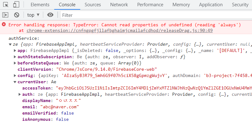 마이페이지에 가입할 때 firebase에 저장된 이메일 주소를 불러오고 싶었다. 프로필 이미지와 닉네임을 불러올 때 사용했던 코드를 그대로 사용하면 될 거 같아서 일단 console.log로 이메일 정보가 어디에 저장되어 있는지 확인했다.