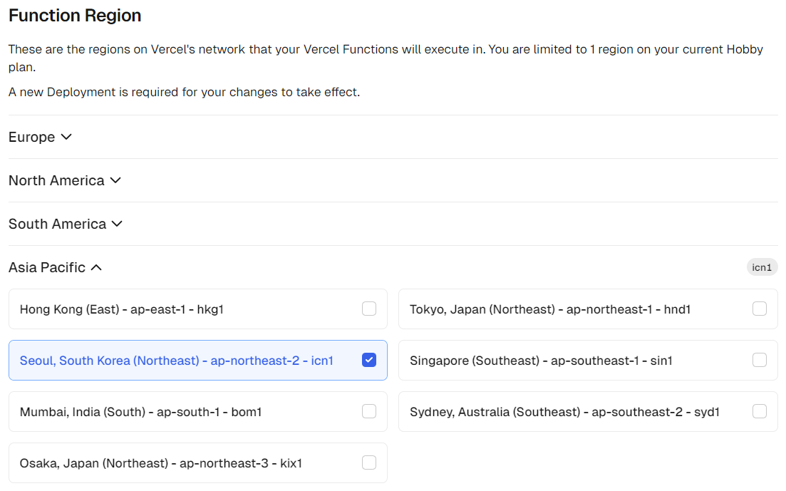 Vercel로 프로젝트를 배포한 이후에 `Settings > Functions`에서 Funtion Region(함수 실행 지역)을 설정할 수 있다.