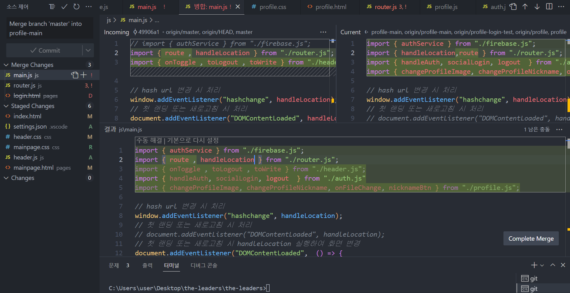 오늘 merge를 총 두 번 했는데(원래 이렇게 자주 하는 건가..?) 처음에는 소스트리에서 진행하고 두 번째는 vscode 터미널 창에서 진행했다. 근데 vscode에서 충돌 관리하는 게 훨씬 편했던 거 같다. 그동안 여기저기 수정한 코드를 어떻게 합치는 걸까 궁금했었는데 그 궁금증을 해결할 수 있었다.
