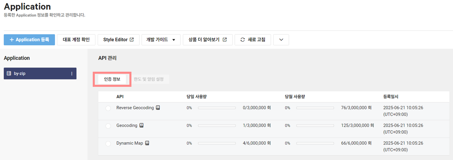 생성된 Application에서 [인증 정보] 버튼을 클릭한다.