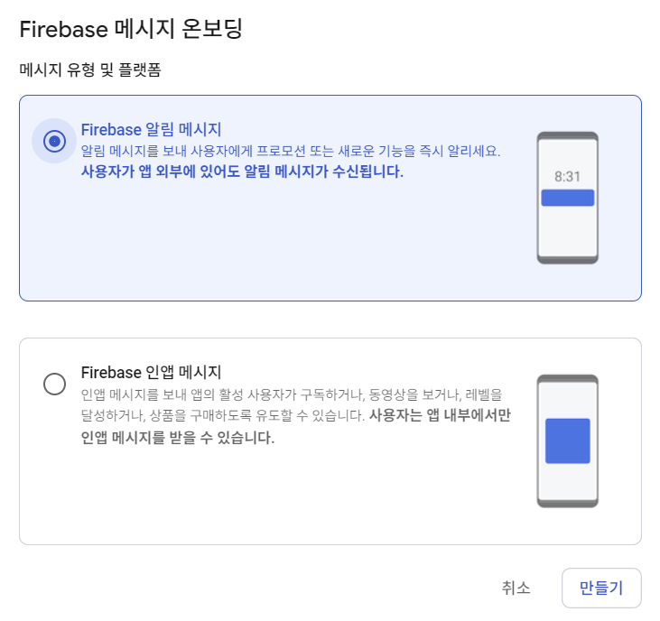 [Firebase 알림 메시지]를 선택한다.