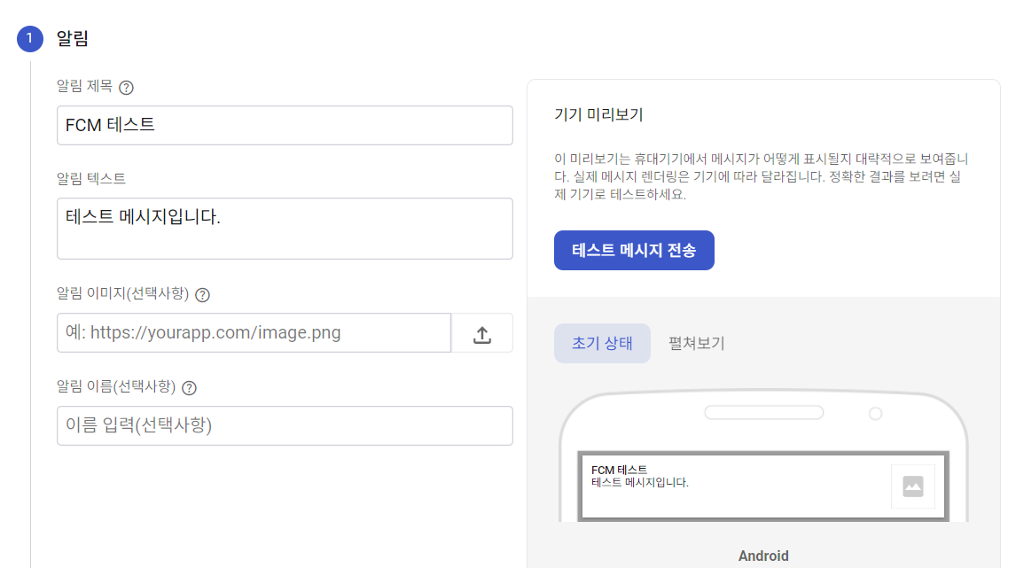 `FCM 등록 토큰`을 추가해서 테스트 메시지를 전송하면