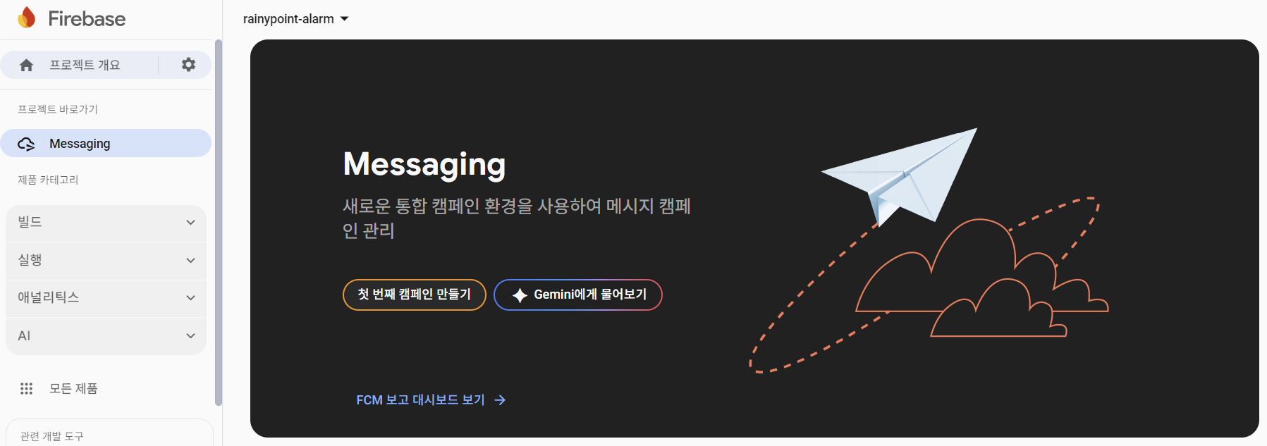 Firebase Messaging 페이지에서 [첫 번째 캠페인 만들기] 버튼을 클릭한다.