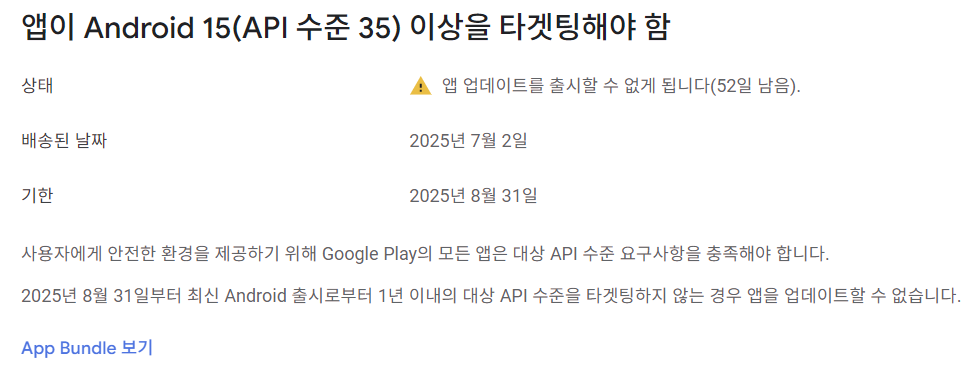 앱이 Android 15(API수준 35) 이상을 타겟팅해야 함
