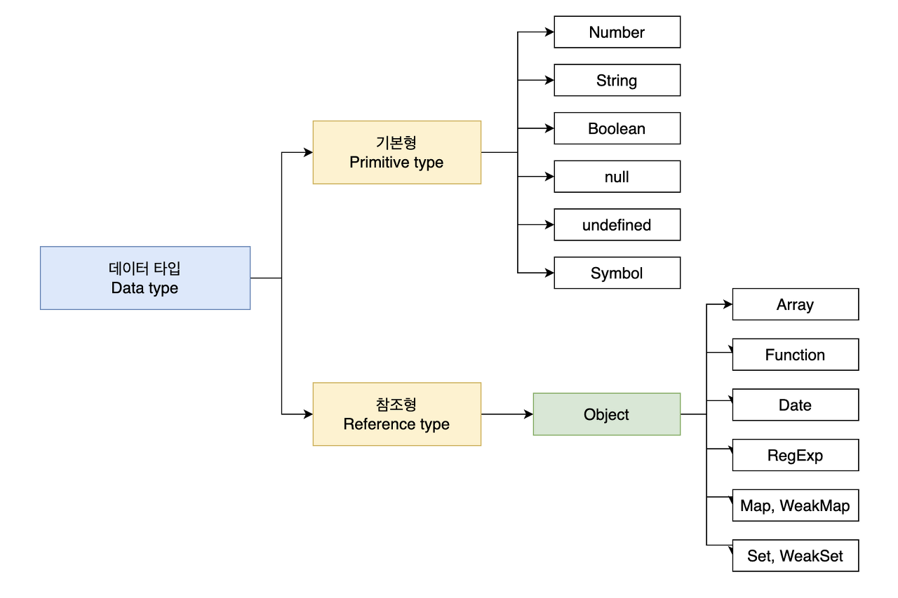 - 참조형 데이터 : 값이 담긴 주소 값들로 이루어진 묶음을 가리키는 주소 값을 복제 (가변값)