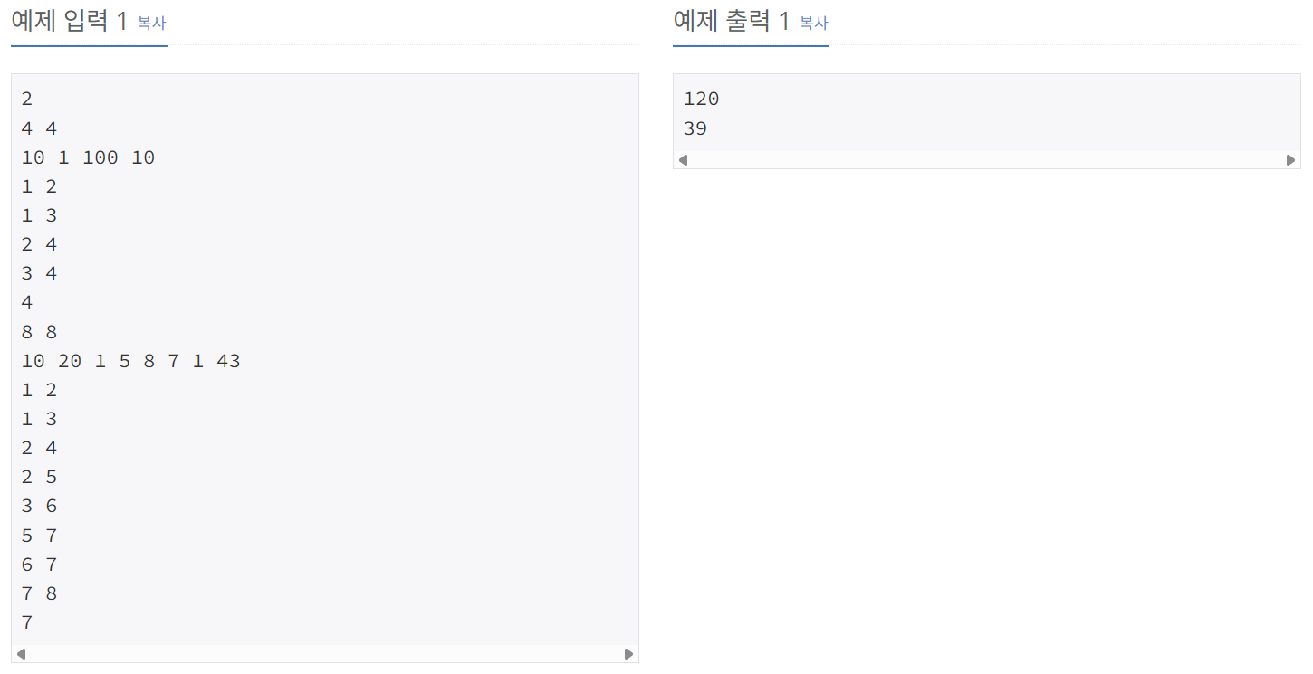 첫째 줄에는 테스트케이스의 개수 T가 주어진다. 각 테스트 케이스는 다음과 같이 주어진다. 첫째 줄에 건물의 개수 N과 건물간의 건설순서 규칙의 총 개수 K이 주어진다. (건물의 번호는 1번부터 N번까지 존재한다)