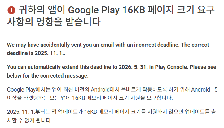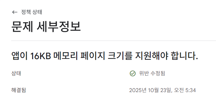 2025년 11월 1일부터는 16KB 페이지 사이즈를 지원하지 않는 앱은 Google Play에 업데이트를 출시할 수 없다고 한다.