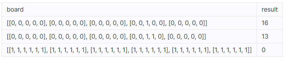 - (3, 2)에 지뢰가 있으므로 지뢰가 있는 지역과 지뢰와 인접한 위, 아래, 좌, 우, 대각선 총 8칸은 위험지역입니다. 따라서 16을 return합니다.
