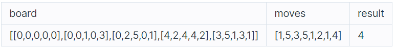 - moves 배열 각 원소들의 값은 1 이상이며 board 배열의 가로 크기 이하인 자연수입니다.