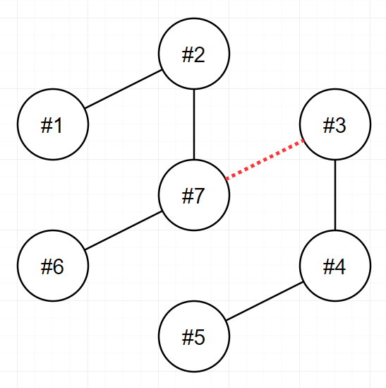 - 4번과 7번을 연결하는 전선을 끊으면 두 전력망은 각 6개와 3개의 송전탑을 가지며, 이보다 더 비슷한 개수로 전력망을 나눌 수 없습니다.