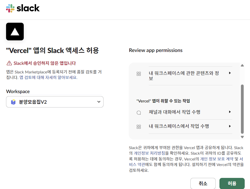 슬랙의 해당 워크스페이스에 Vercel 앱이 추가되었다면, 버튼을 클릭해서 슬랙에서도 다시 한번 Vercel와 연동을 해준다.