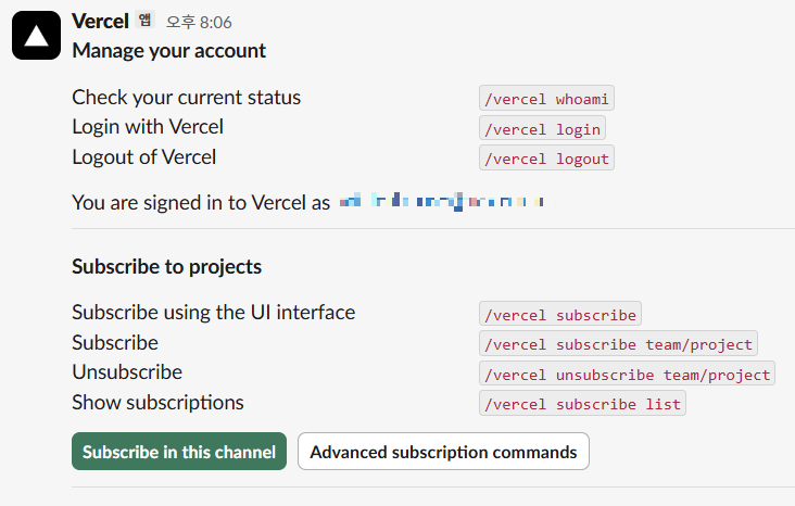 구독이 완료되었는지 확인하고 싶다면 `/vercel subscribe list`를 입력하면 된다.